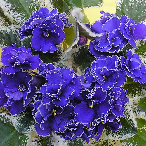 Крупные полумахровые и махровые кобальтово – синие цветы с яркой белой окантовкой. Эффектное обильное цветение! Зелено – белая пестролистность.