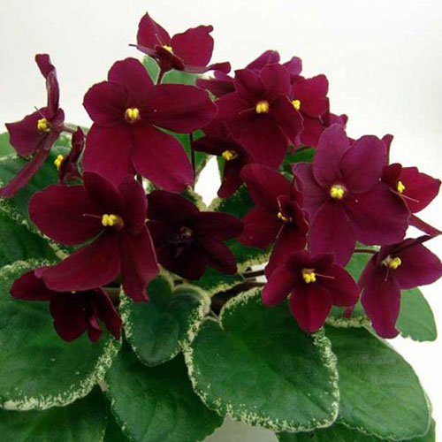 Простые и полумахровые фиалковые цветы совершенно необычайного красно-кровавого цвета обильно покрывают компактную зелено-белую нарядную розетку.
