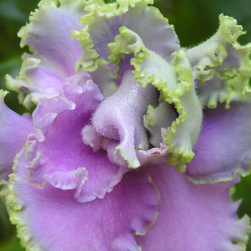Махровые гофрированные двухтоновые серебристо-лавандовые цветки с хаотичными ярко-зелеными отметинами в виде рюшки или отдельных лепестков зеленая волнистая листва.