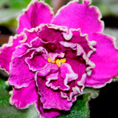 Огромные махровые яркие розово-фуксиевые цветы с четкой белой каймой. Средне-зеленая листва.