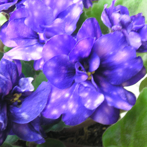 Крупные густомахровые темно-темно-синие бархатистые цветы с обильными горошинами ярко-розового фэнтази и ослепительно белыми точками на лепестках. Обильное “гроздьями” цветение. Средне-зеленая чуть зубчатая листва.