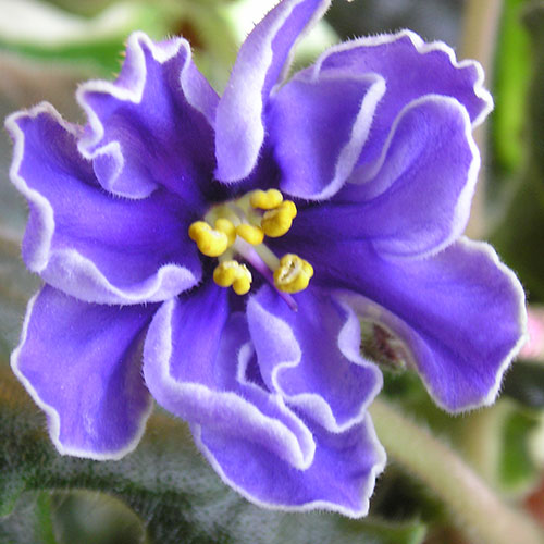 Крупные, 5-6см, ярко-синие звезды с белым кантом над закругленными средне-зелеными листьями.