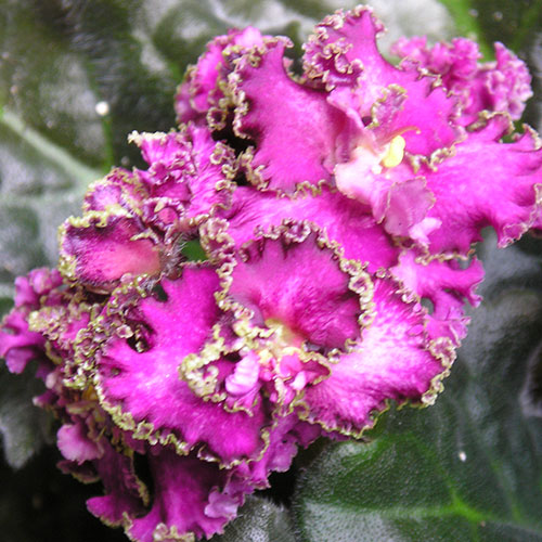 Крупные махровые ярко-фуксиевые цветки, обрамленные сильно гофрированной зеленой бахромкой. Темная, слегка волнистая листва.