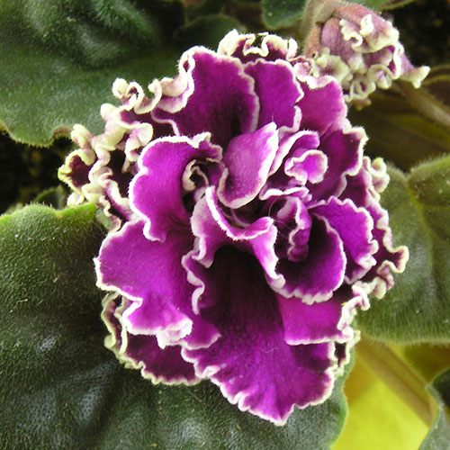 Очень крупный бархатистый темно-вишневый, почти черный очень махровый цветок с толстой белой каймой. Симпатично лохматый. Точно Леший!!!