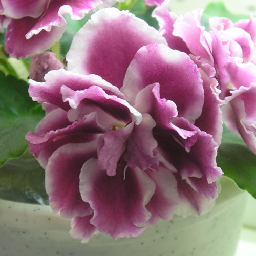 Махровые белые цветки с яркими фуксиевыми мазками на каждом лепестке..