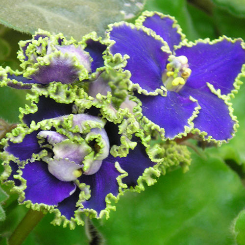 Синие с зелёной бахромой цветы на зелёных волнистых листьях.