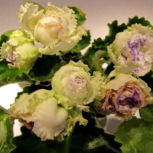 Очень крупные пушистые густомахровые белые цветы-шары с синей кружевной каёмочкой по краю лепестков и зеленой подсветкой изнаночной стороны цветов и бутонов образуют пышную шапку над выставочной розеткой стеганой слегка волнистой листвы.