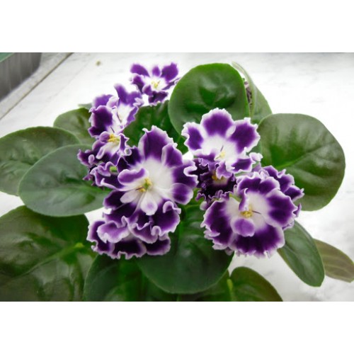 Розетка стандартная. Листья простые, зелёные или тёмно-зелёные.Цветы полумахровые-махровые, фиолетовые с белым центром и белыми краями лепестков.Край лепестков слегка волнистый.