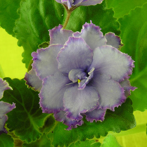Крупные м. и п./м. голубые звезды с более темным глазком и гофрированной каймой, состоящей из широкой полосы пурпурного цвета и карандашного бело-зеленого края. Крупный темно-зеленый лист. Потенциал цветка 7 см и более. Фантастика!