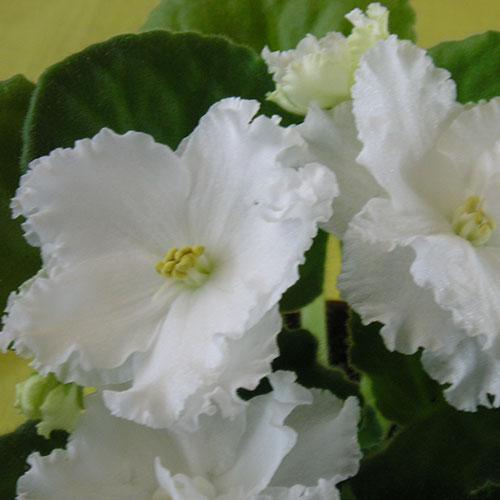 Крупная розетка округлых стеганых листьев, огромные белые махровые цветы с резными кончиками лепестков.