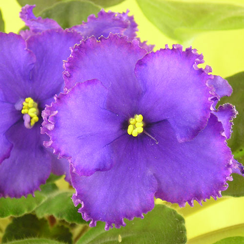 Крупные бархатистые звезды диски насыщенно синего цвета с широкой (2-3мм) красно-пурпурной каймой и мелкой золотистой рюшей по краям (при пониженных температурах). Высокие цветоносы. Блестящая темно-зеленая стеганая листва.