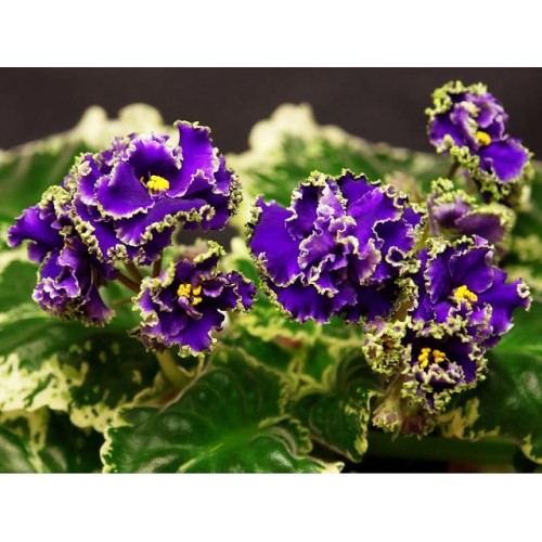 Очень крупные ярко-синие простые и полумахровые волнистые цветы с зеленными бахромчатыми краями , при низких температурах появляется белоснежная кайма и белый глазок.Розетка:красивейший пестролистник из насыщенно-зелёных листьев с красноватой подложкой и белоснежными краями.